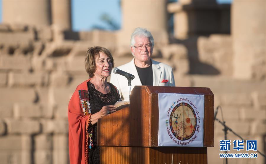 10月27日,在位于埃及阿斯旺的菲萊神廟,中非藝術(shù)節(jié)創(chuàng)始人蘇海爾·阿卜杜勒-卡迪爾在開(kāi)幕式上發(fā)言。 新華社記者 鄔惠我 攝