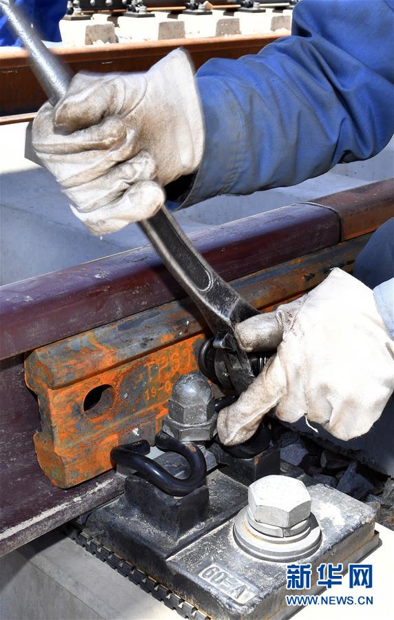 6月6日,負責(zé)鋪軌的中鐵十一局集團的建設(shè)者在現(xiàn)場作業(yè)。新華社記者李鑫攝