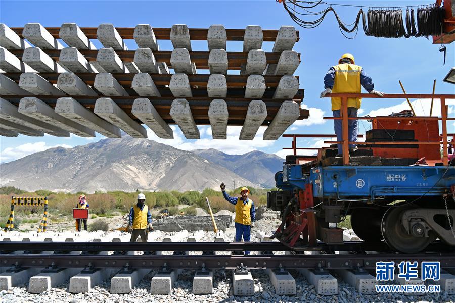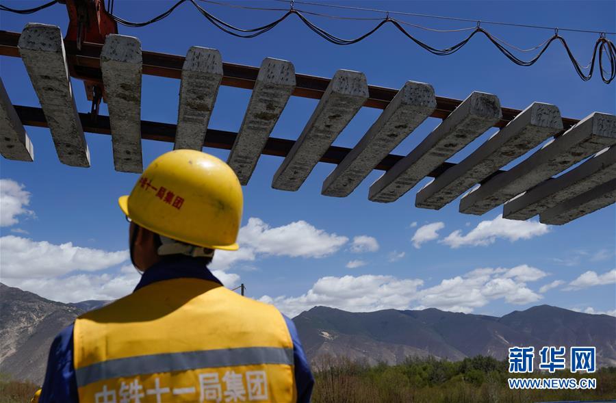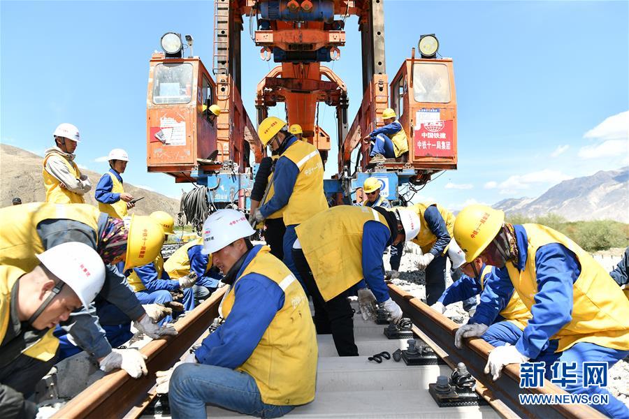 6月6日,負責(zé)鋪軌的中鐵十一局集團的建設(shè)者在現(xiàn)場作業(yè)。新華社記者普布扎西攝