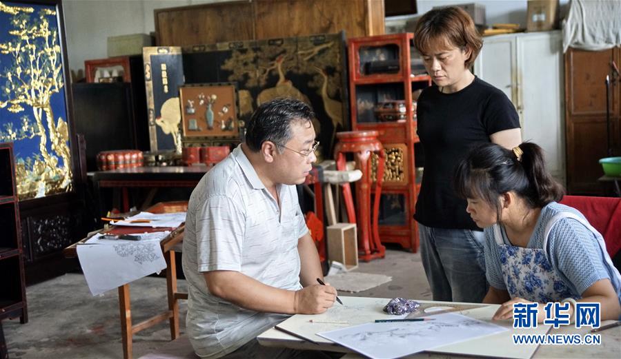 北京金漆鑲嵌有限責任公司工藝美術大師王學兵(左)在和技師們交流漆畫創(chuàng)作(10月31日攝)。新華社記者李欣攝