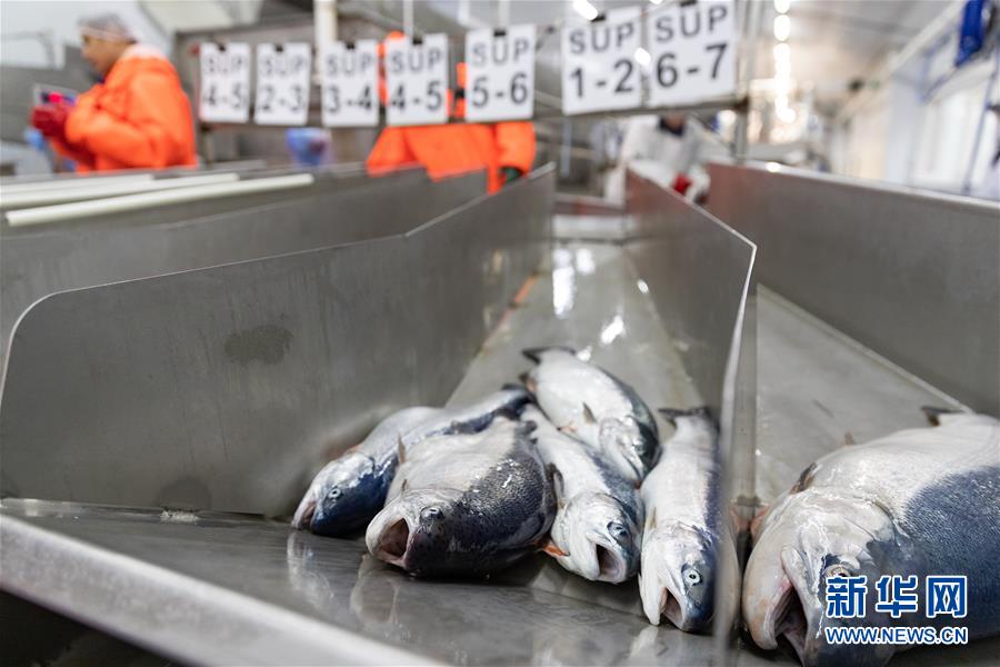 這是9月13日在位于俄羅斯摩爾曼斯克的俄羅斯水產(chǎn)養(yǎng)殖公司車間內(nèi)拍攝的分揀后的鮭魚。 新華社記者白雪騏攝