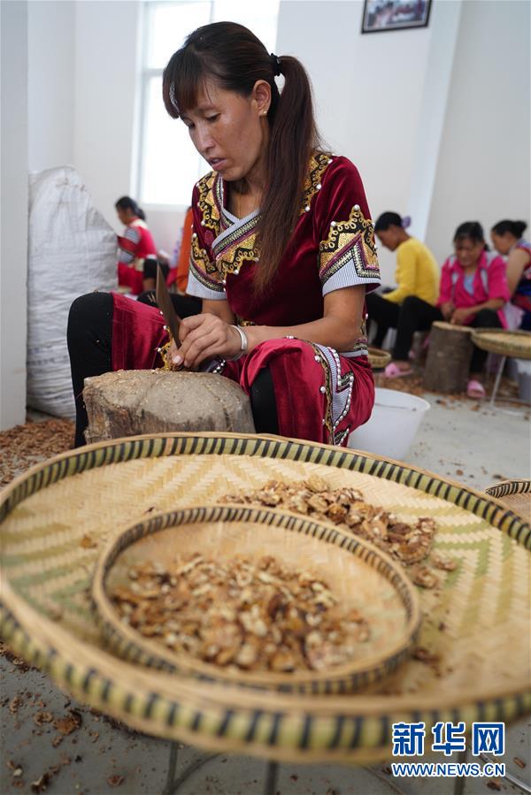 在大興地鎮(zhèn)維拉壩“珠海小區(qū)”內(nèi)的農(nóng)產(chǎn)品加工扶貧車間,村民李南珍在剝核桃仁(6月24日攝)。新華社記者秦晴攝