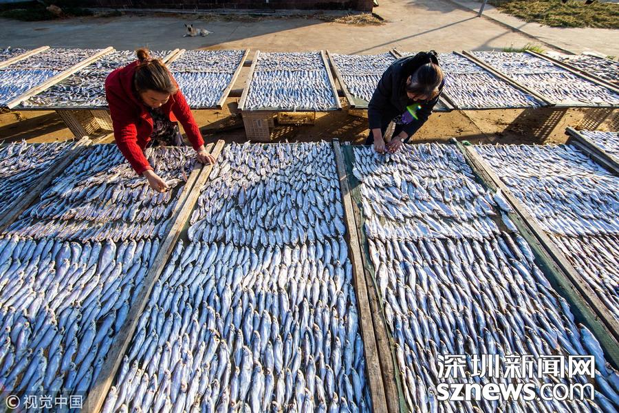 鄱陽湖畔漁民趁秋光晾魚蝦慶豐收