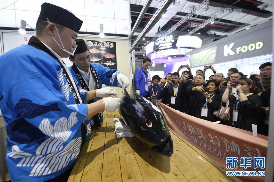 11月7日,來自日本長崎魚市株式會社的專業(yè)切魚師傅為解體70公斤藍(lán)鰭金槍魚做準(zhǔn)備。第二屆中國國際進(jìn)口博覽會正在上海國家會展中心舉行。博覽會的食品及農(nóng)產(chǎn)品展區(qū)里匯集了來自世界各地的美食,同時也上演各種精彩美食秀。11月7日,來自日本長崎魚市株式會社的專業(yè)切魚師傅現(xiàn)場解體一條70公斤的藍(lán)鰭金槍魚,吸引大量參觀者觀看、品嘗。新華社記者王鵬攝