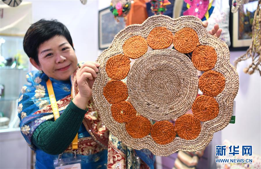 在第二屆進博會品質(zhì)生活展區(qū),孟加拉國達達公司工作人員展示黃麻制品(11月8日攝)。新華社記者范培珅攝