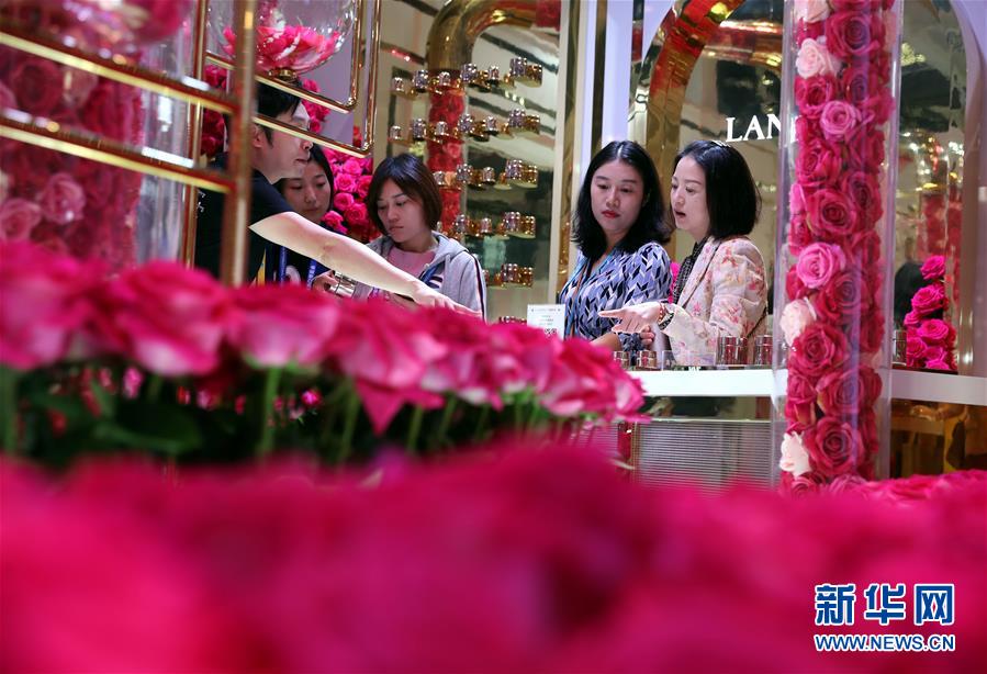 參觀者在第二屆進博會品質(zhì)生活展區(qū)一家化妝品展臺參觀(11月6日攝)。新華社記者劉穎攝