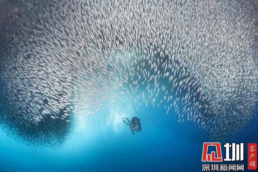 2018年12月24日報道(具體拍攝時間不詳),這張驚艷的照片記錄了沙丁魚大軍為一位幸運的潛水員讓路的瞬間,數(shù)百萬條銀光閃閃的小魚兒簇擁圍繞在他的一側(cè),恰似熠熠生輝的繁星,如眾星捧月一般畫面十分驚艷。
