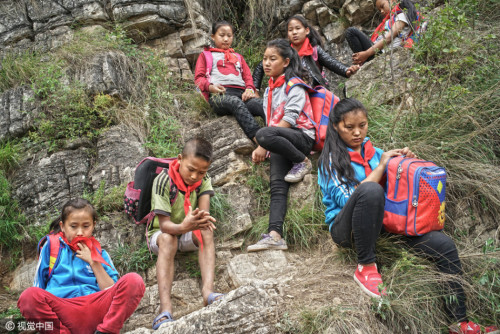 上學的孩子都背著沉沉的書包,大多數(shù)是女孩,15個孩子在三個家長的保護下,大約用了2個小時,到達“懸崖村”。上山容易下山難,遇到雨雪天氣,村里人就不再外出了。 圖片來源:視覺中國
