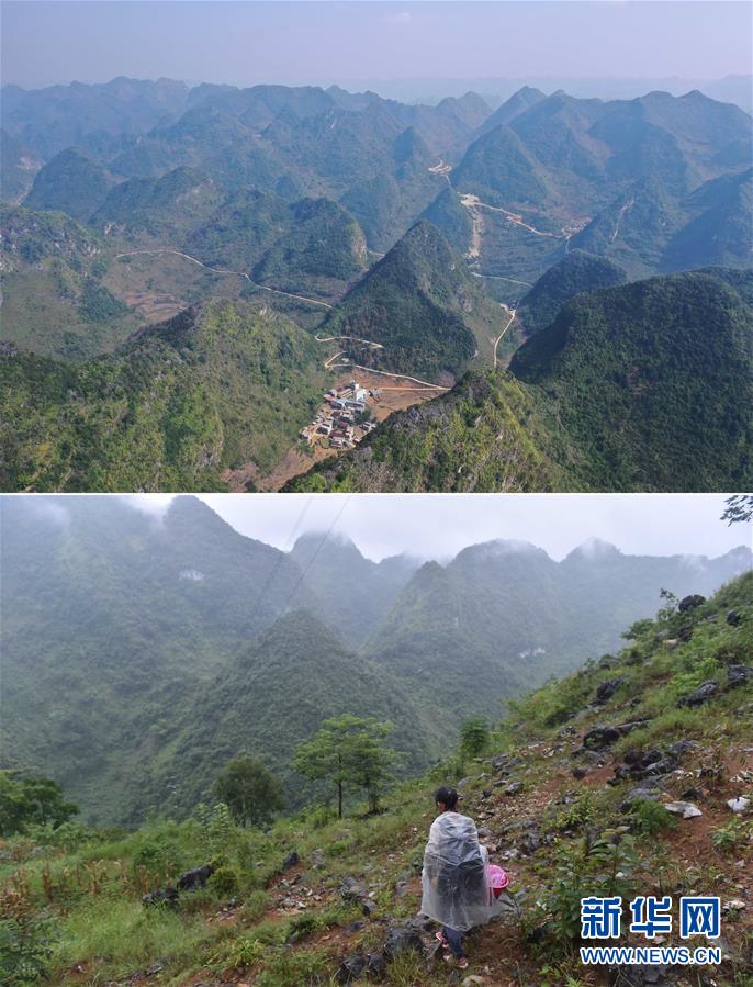 拼版照片:上圖為已經(jīng)修通公路的大化瑤族自治縣板升鄉(xiāng)弄勇村各自然屯(11月11日無人機拍攝);下圖為在弄勇村弄炮屯,一名小學生爬山路去學校(2016年9月1日攝)。新華社記者 黃孝邦 攝