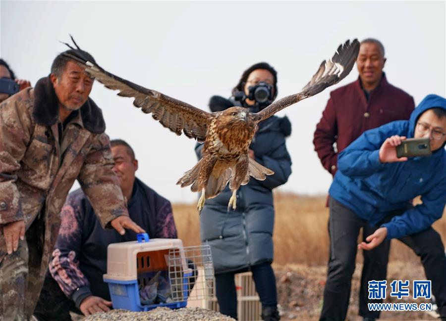 11月16日,在樂亭縣野生動物保護(hù)協(xié)會大清河鳥類救助站,工作人員放飛一只普通鵟。新華社記者楊世堯攝