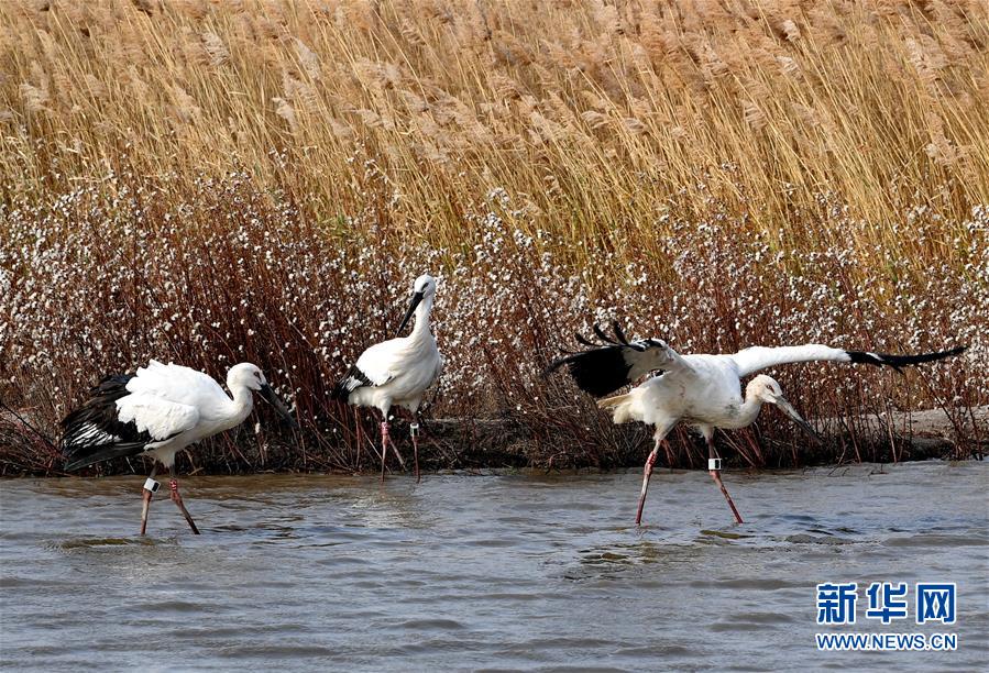 這是在樂亭縣野生動物保護(hù)協(xié)會大清河鳥類救助站放飛回歸大自然的三只國家一級保護(hù)動物東方白鸛(11月16日攝)。新華社記者楊世堯攝