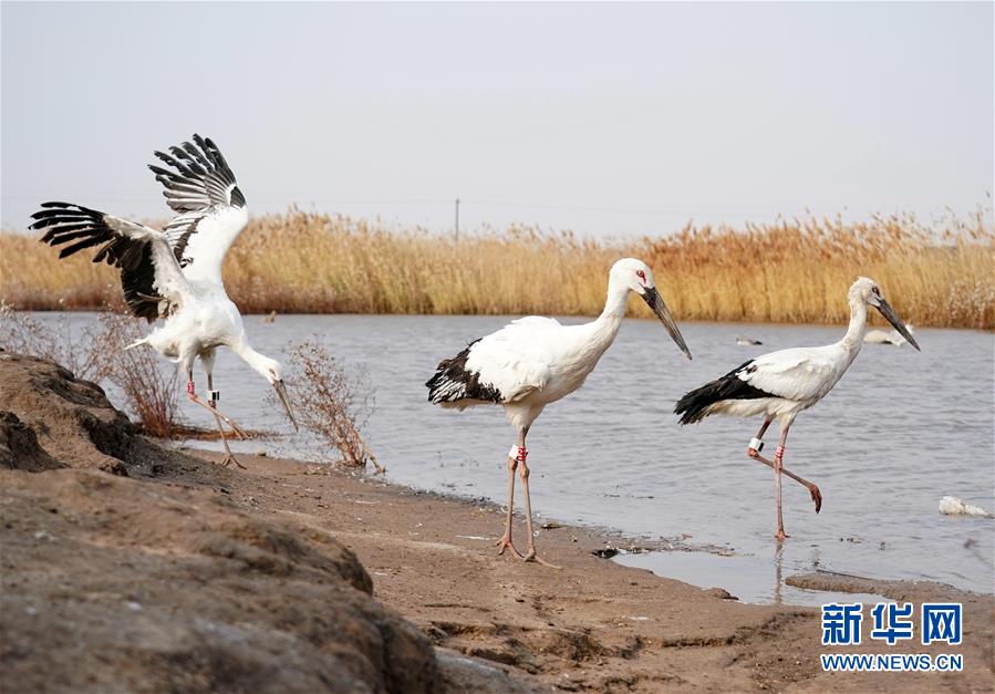 這是在樂亭縣野生動物保護協(xié)會大清河鳥類救助站放飛回歸大自然的三只國家一級保護動物東方白鸛(11月16日攝)。新華社記者楊世堯攝