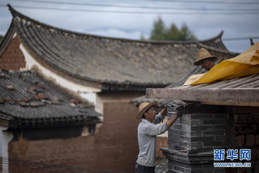工人邱社云(左)在石屏縣異龍鎮(zhèn)符家營村211號(hào)民居修繕圍墻(8月8日攝)。新華社記者江文耀攝