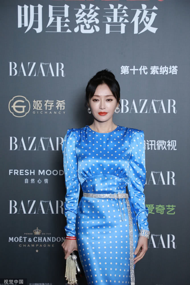 秦嵐穿波點(diǎn)藍(lán)裙身姿婀娜,靈動(dòng)飄逸似美人魚(yú)。