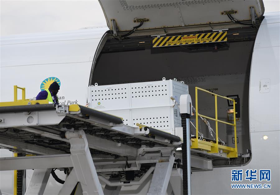 11月19日,在美國華盛頓附近的杜勒斯國際機場,裝有大熊貓“貝貝”的箱子被運上飛機。 新華社記者 劉杰 攝