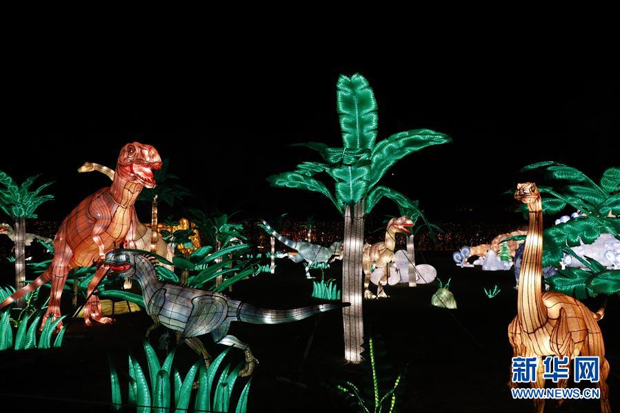 這是11月20日在美國紐約斯塔滕島第二屆紐約花燈游園會上拍攝的恐龍花燈。當日,第二屆紐約花燈游園會在美國紐約斯塔滕島開幕,50余組各類花燈照亮夜空,吸引觀眾前來賞燈游玩。新華社記者李木子攝
