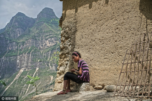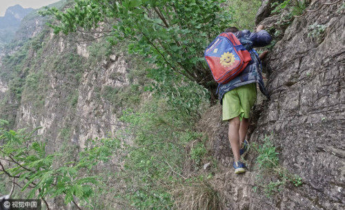 上學(xué)的孩子都背著沉沉的書包,大多數(shù)是女孩,15個(gè)孩子在三個(gè)家長(zhǎng)的保護(hù)下,大約用了2個(gè)小時(shí),到達(dá)“懸崖村”。上山容易下山難,遇到雨雪天氣,村里人就不再外出了。圖片來源:視覺中國(guó)