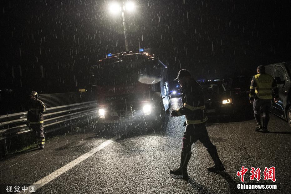 當?shù)貢r間2019年11月24日,意大利Villafranca dAsti,意大利遭受惡劣天氣和持續(xù)多日的暴雨,通往都靈方向的A21高速公路路面出現(xiàn)“大坑”。圖片來源:視覺中國