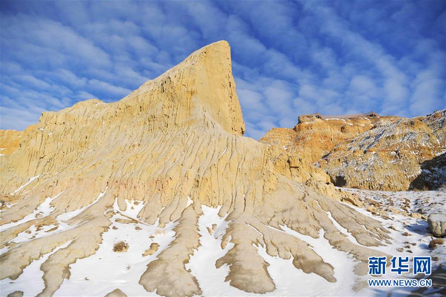 11月26日拍攝的新疆福海縣烏倫古湖海上魔鬼城景區(qū)美景。福海縣烏倫古湖海上魔鬼城景區(qū)位于新疆阿勒泰地區(qū)福??h吉力湖東岸,有著獨(dú)特的雅丹地貌和水域景觀,是當(dāng)?shù)刂穆糜蝿俚?。新華社記者沙達(dá)提攝