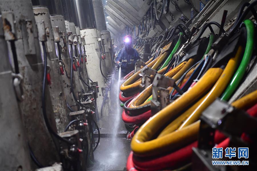 11月26日,在上灣煤礦12402綜采面內(nèi),工作人員對液壓支架區(qū)域進行沖洗清潔。 新華社記者 邵瑞 攝