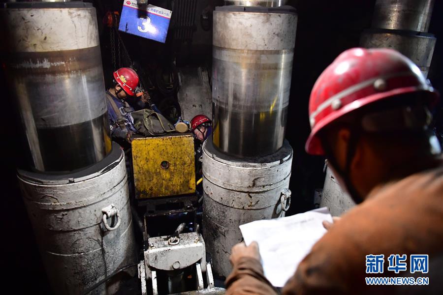 11月26日,在上灣煤礦12402綜采面內(nèi),工作人員對(duì)照清單檢修液壓支架。 新華社記者 邵瑞 攝