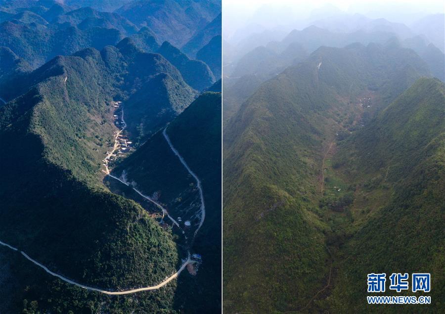 拼版照片:上圖為已經(jīng)修通水泥路的大化瑤族自治縣板升鄉(xiāng)八好村八好屯(11月11日無人機(jī)拍攝);下圖為在尚未通路的八好村八好屯,村民背著年貨走山路回家(2016年1月26日攝)。新華社記者黃孝邦攝