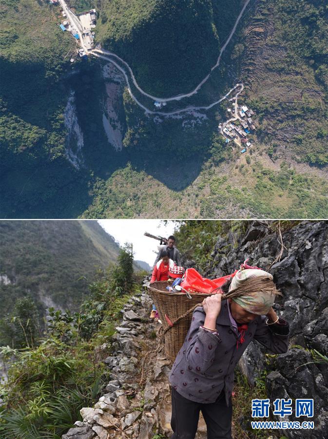 拼版照片:上圖為已經(jīng)修通水泥路的大化瑤族自治縣板升鄉(xiāng)八好村八好屯(11月11日無人機拍攝);下圖為在尚未通路的八好村八好屯,村民背著年貨走山路回家(2016年1月26日攝)。新華社記者黃孝邦攝
