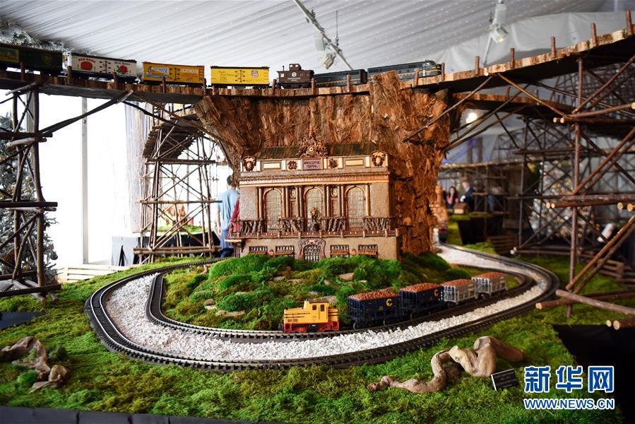 11月26日,在美國紐約植物園節(jié)日小火車展上,模型小火車駛出紐約中央車站微縮模型。新華社記者韓芳攝