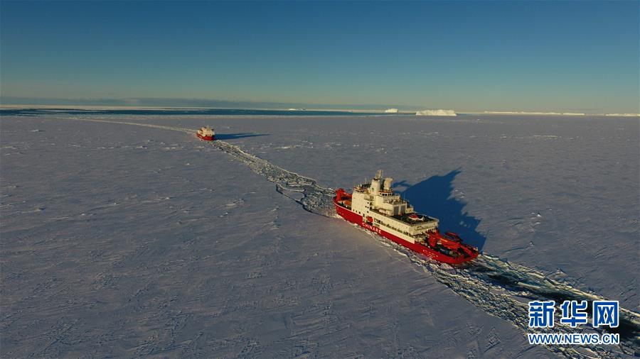 “雪龍”號(hào)與“雪龍2”號(hào)在新開(kāi)辟的航道上(11月21日無(wú)人機(jī)拍攝)。