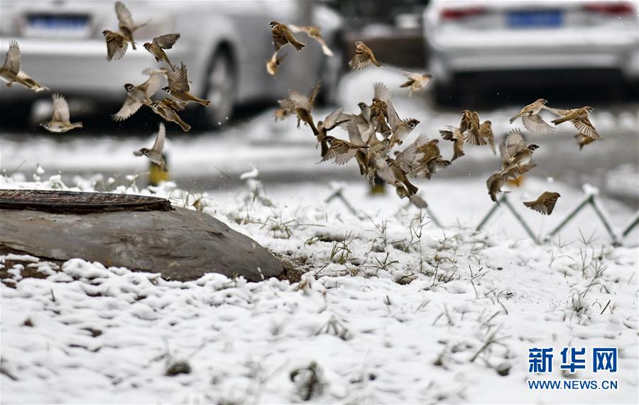 11月30日拍攝的在雪中覓食的麻雀。 新華社記者 李欣 攝