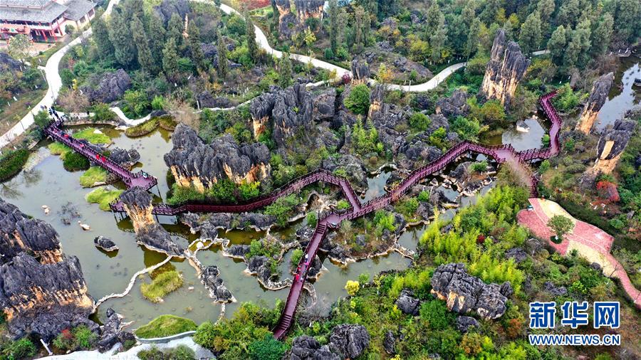 11月28日,游客在石林景區(qū)游覽(無人機拍攝)。新華社記者江文耀攝