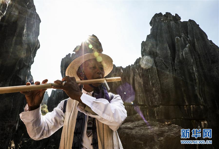 當?shù)厣贁?shù)民族樂手在石林景區(qū)演奏民族音樂(11月27日攝)。新華社記者蘭紅光攝