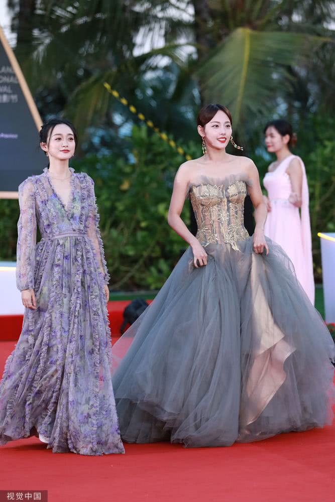2019年12月1日,三亞,第二屆海南島國(guó)際電影節(jié)。何泓姍彎腰為張嘉倪整理裙擺,跟此前劇中傲嬌跋扈的“玫嬪”人設(shè)大不相同。