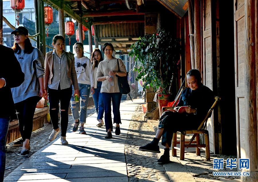 游客在武夷山下梅村游覽(11月5日攝)。福建省武夷山市下梅村是“中國歷史文化名村”,這里歷史悠久,人文薈萃,至今保存著70余幢明清時代的古民居。人工運河穿村而過,古民居、涼亭、古街等構成了別具特色的江南水鄉(xiāng)風景。新華社記者馬平攝