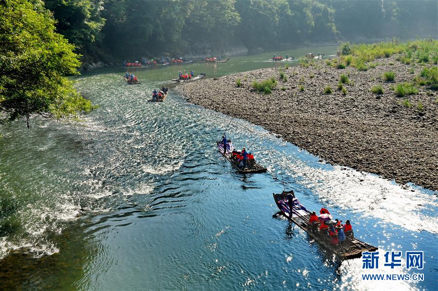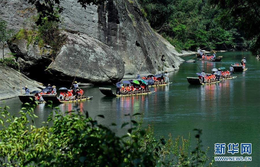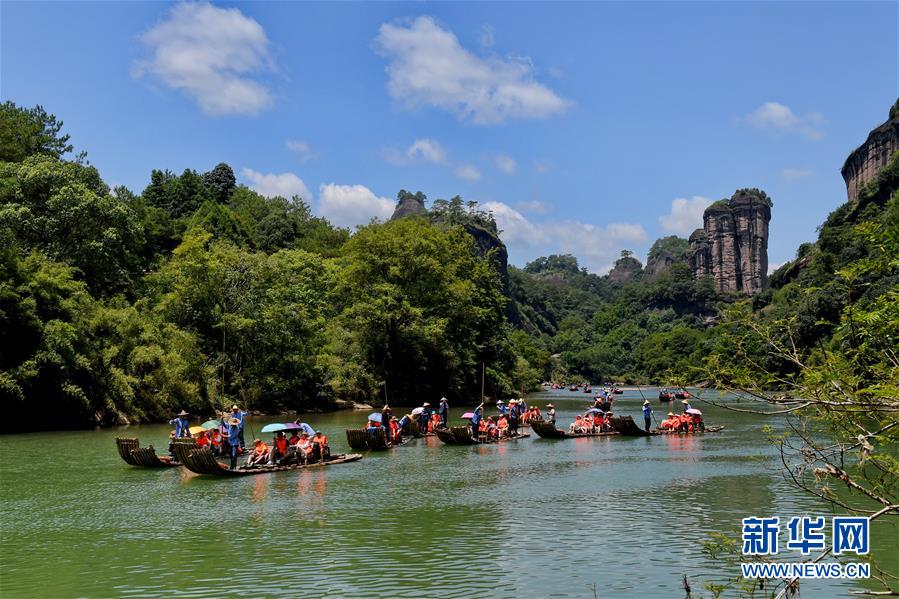游客在武夷山九曲溪上漂流(8月4日攝)。新華社記者張國俊攝