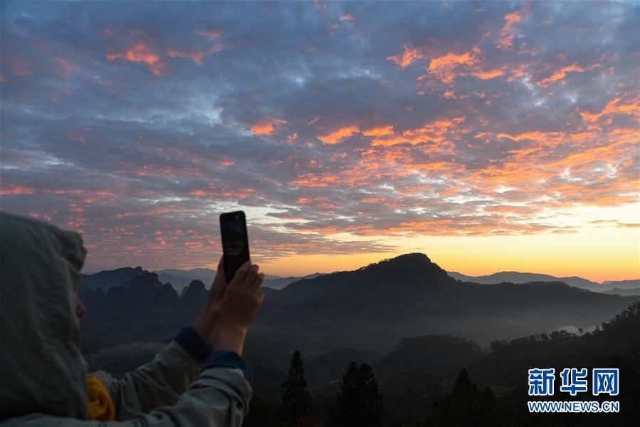11月17日,在福建省武夷山風景名勝區(qū)齊云峰附近,游客在拍攝朝霞。新華社記者宋為偉攝
