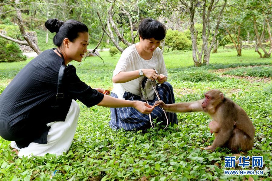 游客在武夷山自然保護區(qū)喂猴(7月20日攝)。新華社記者張國俊攝
