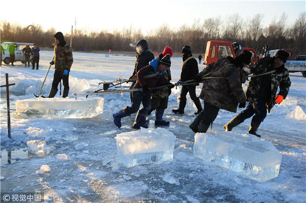 2018年12月8日,最低氣溫零下22度,哈爾濱市江北公路大橋東側(cè)的江面上,工人們正在從江中撈取冰塊,裝車運(yùn)往景區(qū)制作冰燈、冰雕。現(xiàn)場,工人先是用電鋸、鐵釬將冰分割成半米多寬,一米多長的冰塊,接著將其拉出水面。等候在旁的叉車上前,將冰裝上運(yùn)冰的卡車,之后裝滿冰塊的卡車駛往景區(qū)。