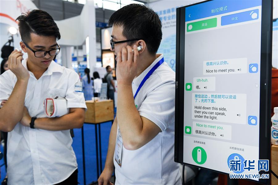 2018年11月16日,在深圳舉行的第20屆高交會上,來自深圳的年輕創(chuàng)客(右)向參觀者介紹團隊研發(fā)的同聲傳譯耳機。 新華社記者 毛思倩 攝
