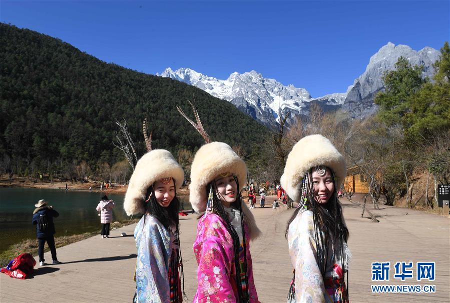 2月14日,游客在麗江玉龍雪山藍(lán)月谷留影。