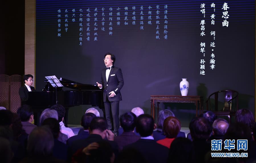 12月10日晚,廖昌永在音樂(lè)會(huì)上演唱《春思曲》。 當(dāng)晚,中國(guó)古典詩(shī)詞與書(shū)畫(huà)——廖昌永中國(guó)藝術(shù)歌曲獨(dú)唱音樂(lè)會(huì)在北京中國(guó)美術(shù)館舉行。 新華社記者 魯鵬 攝