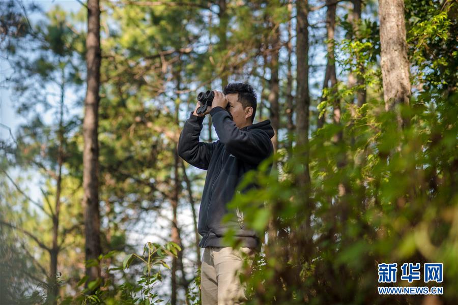 羅康在哀牢山的松樹(shù)林里觀測(cè)鳥(niǎo)類(12月12日攝)。 新華社記者 胡超 攝