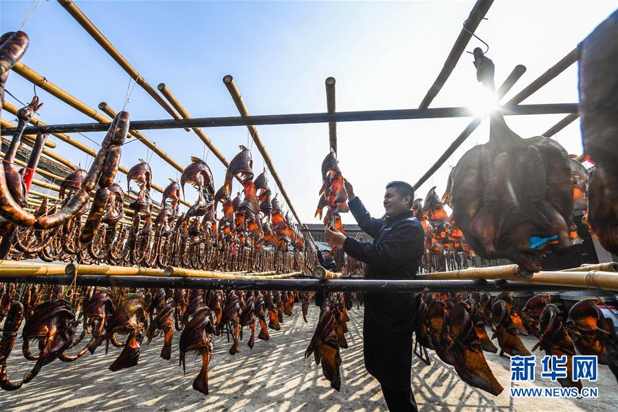 初冬時(shí)節(jié),浙江省紹興市柯橋區(qū)安昌古鎮(zhèn)開啟了傳統(tǒng)臘味制作、上市的季節(jié)。當(dāng)?shù)匕傩沼脗鹘y(tǒng)醬油、黃酒、香料等手工腌制臘腸、醬鴨、魚干、醬鵪鶉、醬排骨等紹興特色醬貨,在冬季的陽光下進(jìn)行晾曬,滿街飄香的臘味也成了這座江南古鎮(zhèn)的獨(dú)特風(fēng)景。安昌古鎮(zhèn)是浙江省歷史文化名鎮(zhèn),有著一千多年歷史,比較完善地保存了古吳越地區(qū)沿襲千百年來的民俗風(fēng)情。每年大雪節(jié)氣前后,安昌當(dāng)?shù)匕傩瞻凑諅鹘y(tǒng)習(xí)俗挑選晴朗好天氣制作、晾曬傳統(tǒng)醬貨,各類醬貨顏色黑紅油亮,咸鮮適口,是當(dāng)?shù)囟镜奶厣珎鹘y(tǒng)美食。新華社記者徐昱攝