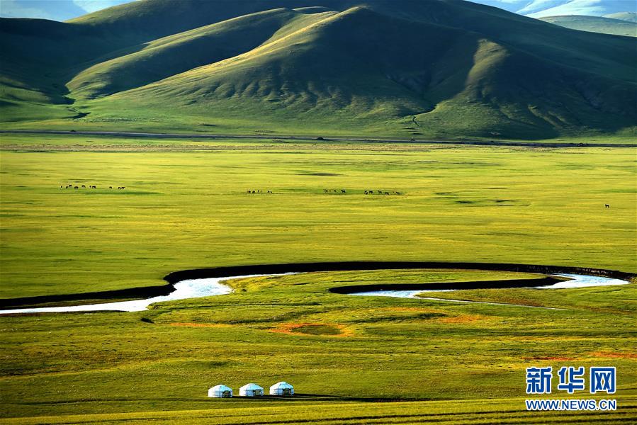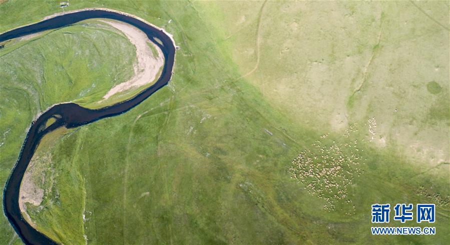 8月29日無(wú)人機(jī)拍攝的內(nèi)蒙古呼倫貝爾市陳巴爾虎旗境內(nèi)的莫日格勒河與羊群。新華社記者李京攝