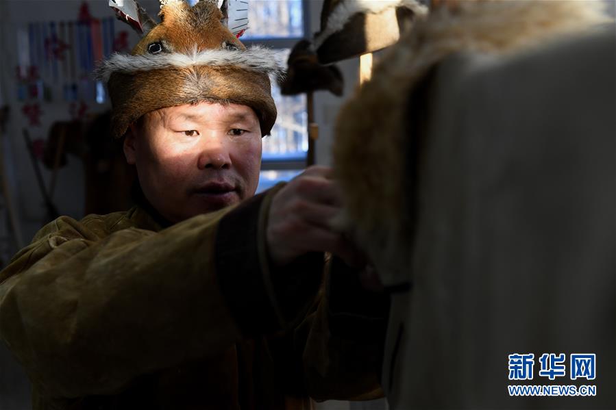 12月10日,在古里鄉(xiāng)非遺傳習(xí)所,鄂倫春族人吳曲忠在整理一件皮制衣服。新華社記者劉磊攝