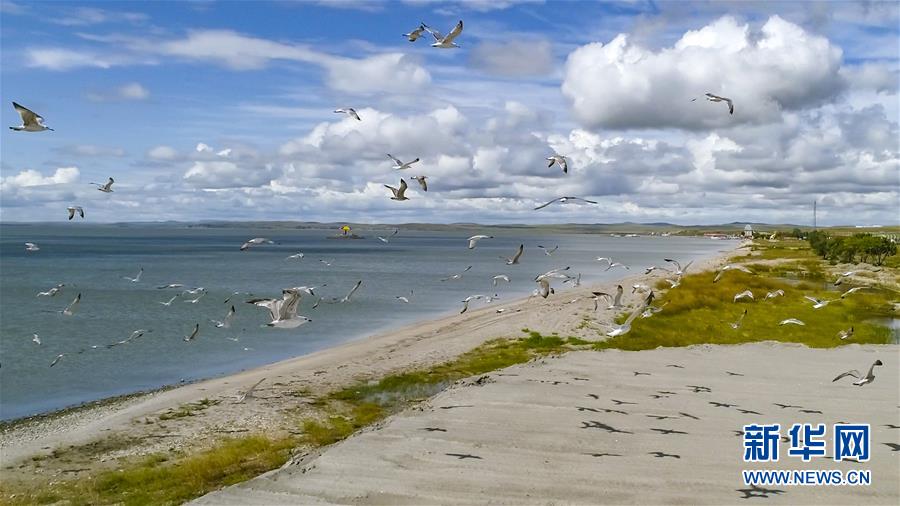 8月28日無(wú)人機(jī)拍攝的呼倫湖畔的水鳥(niǎo)。新華社記者沈伯韓攝