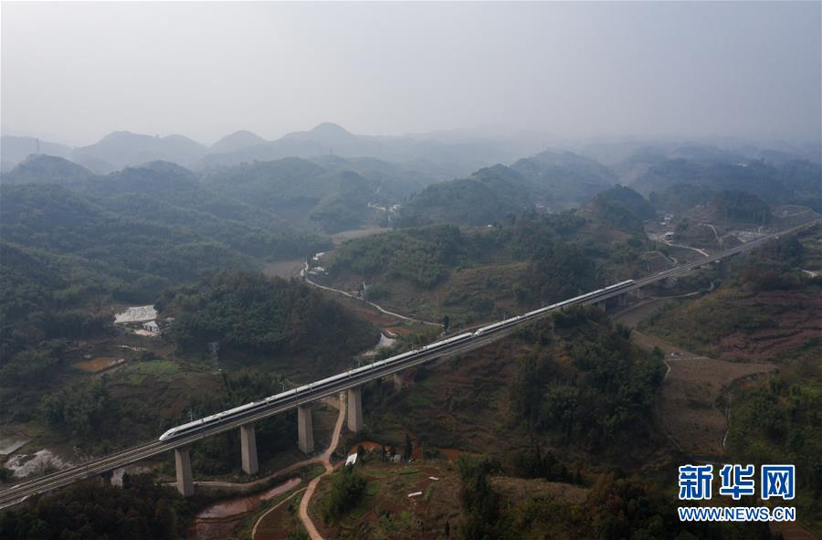 12月16日,一列動(dòng)車組列車從成貴高鐵鴨池河特大橋上駛過(無(wú)人機(jī)拍攝)。新華社記者歐東衢攝