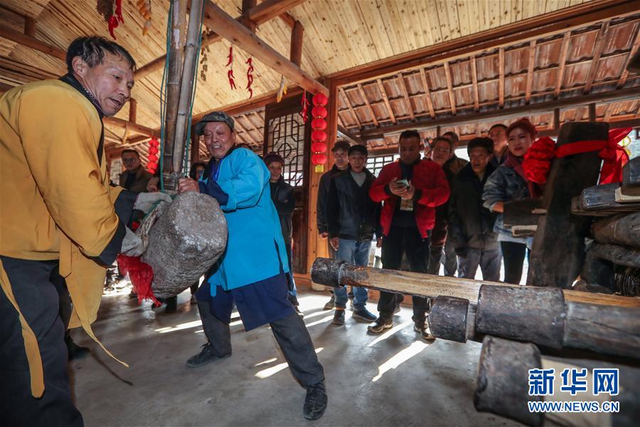 12月15日,工作人員在老油坊內(nèi)通過撞擊的方式將不同尺寸的木楔插入木龍,進(jìn)而榨出茶餅中的茶油。  新華社記者 徐昱 攝