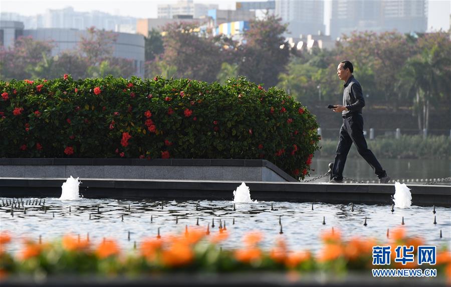 12月17日,市民從南寧市南湖邊綠樹鮮花間走過。 新華社記者 陸波岸 攝