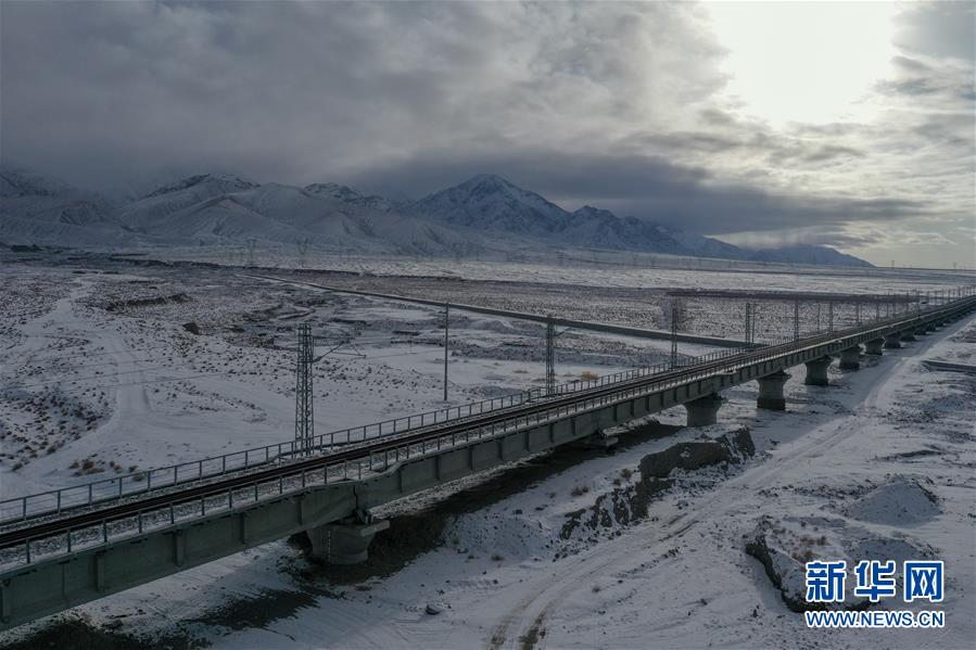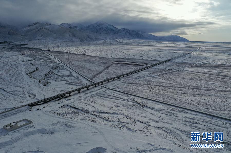 這是12月16日無人機(jī)拍攝的敦煌鐵路大柴旦站附近的一處鐵路橋。新華社記者張龍攝